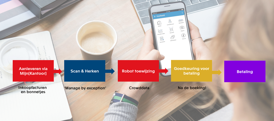 Het werkt simpel. Via Mijn[Kantoor] levert je klant bonnen digitaal aan. De verwerking vindt automatisch plaats. Met gemak boek je 300 facturen in een uur. Alle facturen zijn op één centrale plek gedigitaliseerd. Zo vind je ze snel terug en zijn ze zowel voor jou als voor de klanten altijd en overal beschikbaar, inclusief zeer flexibele goedkeuring voorafgaand aan de betaling. Denk bijvoorbeeld aan meerdere workflowstappen, leveranciers of limietafhankelijke goedkeuring. Bovendien heb je met een totaaloplossing als dit één aanspreekpunt. Schakelen tussen verschillende software is dus niet meer nodig. Daarnaast zit Exact niet stil en profiteer je van onze innovaties.